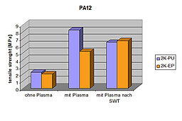 Bonding PA12 using polyurethane and epoxy adhesives. This graph shows a definite increase in tensile shear strength of the plastics treated with plasma. Even after a one-week saturated atmosphere test, the bond still exhibits high strength values.