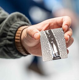 Our printing workshop is equipped with an industrial printer for processing UV-curing paints and coatings. Here we can demonstrate and test the print adhesion of solvent-free inks as well as the reliable, long-time stable adhesion of print to challenging surfaces such as polypropylene (PP), polyethylene (PE), polyamides (PA), polycarbonate (PC), glass and metal.